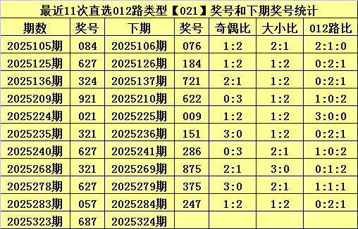 罗列三上期开出奖号为:687,其直选012路类型为021,历史上直选021号码已开出了257次,最近11期分辨开出奖号为:084、627、324、921、021、321、627、321、627、057、687。